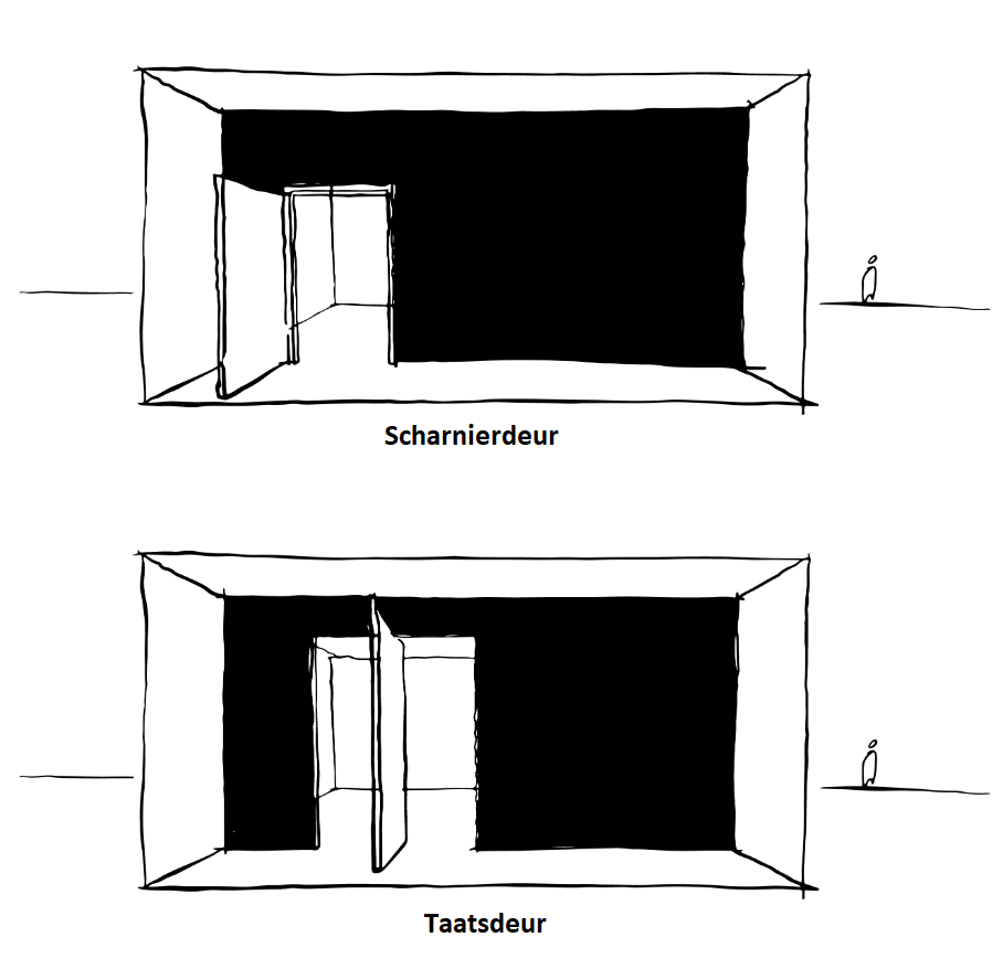 Bij een taatsdeur bevinden de scharnierpunten zich zowel in de vloer als in het plafond. Dit maakt het mogelijk de vloer en het plafond tussen twee ruimtes door te laten lopen. Om dit te realiseren, bouwen wij een mechanisme in de vloer of deur. De scharnierpunten bevinden zich niet helemaal aan het uiteinde, maar op ongeveer een vijfde van de deur. Hierdoor opent de deur naar twee kanten tot negentig graden. Een taatsdeur valt niet in een kozijn, waardoor er altijd een minimale ruimte overblijft. De kans dat je kinderen hun vingertjes tussen de deur krijgen is zeer klein.